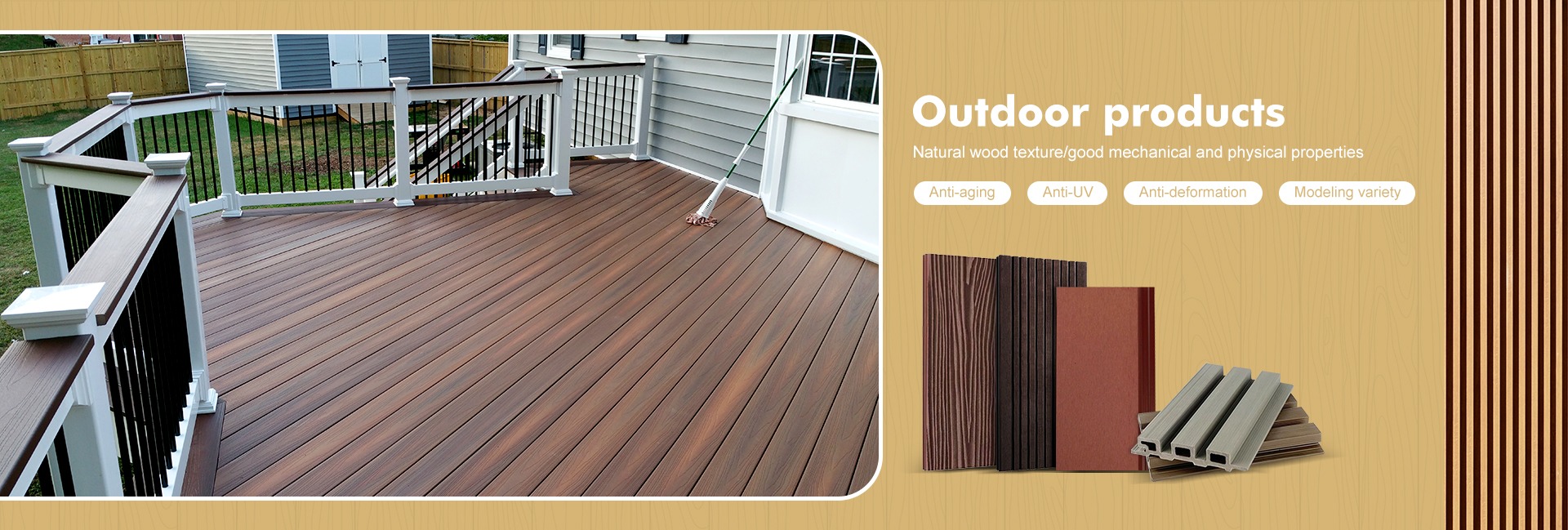 Productos principales:Panel de pared de WPC, panel de pared en relieve de WPC, panel de pared integrado, tubo de madera de WPC, techo de WPC